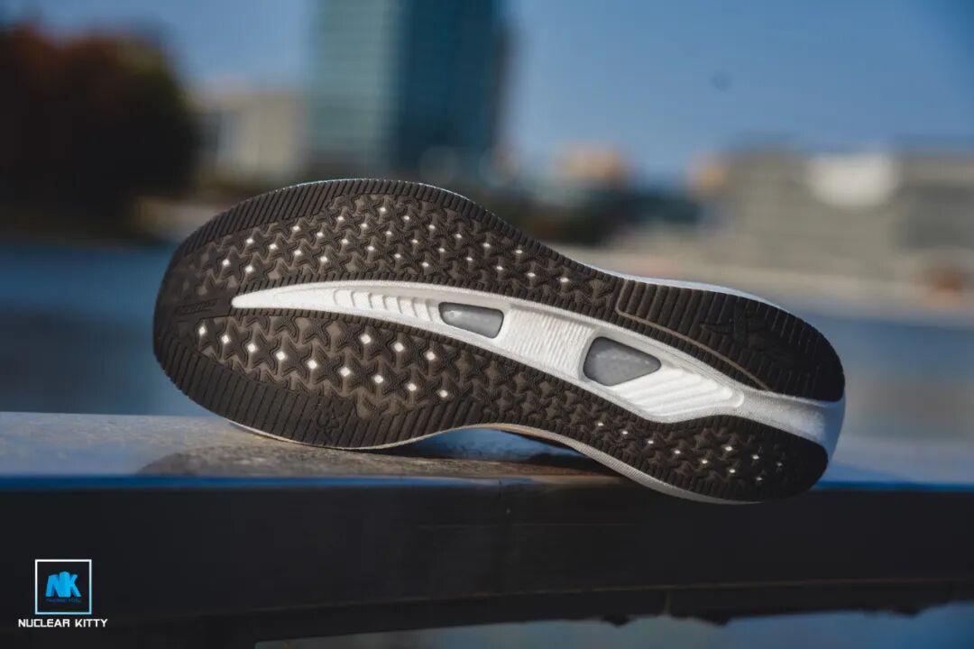 他上脚之后最直不雅感受是轻和弹。看似较厚的中底,每一次抬脚却莫得蒙眬感,回弹很径直,在跑间歇的时候澄莹随机感受到中底的鼓舞力,在渐渐堆量的LSD ,又能感受到缓震成果佳,落地的每一步都很安闲,长距离下依旧能保持住节拍。